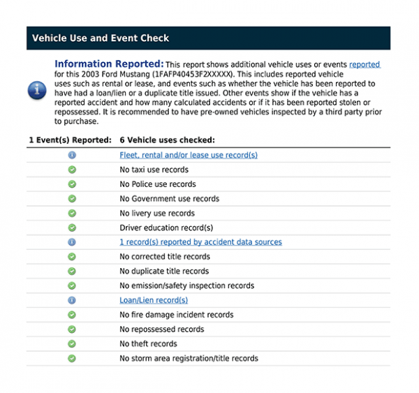 Accident Check shows the number of accidents reported if such occurred. Each event, has date and location.